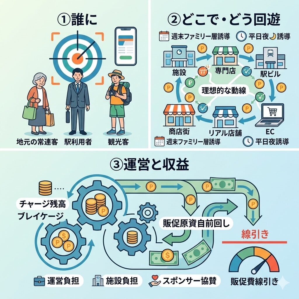 独自ペイで商圏をデザインするうえで、特に重要な設計軸は三つあります。