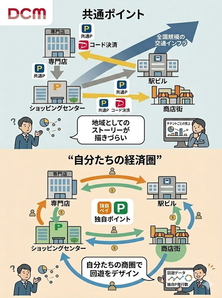 共通ポイントや外部の決済プラットフォームは、“全国規模の交通インフラ”のようなものです。一方で、百貨店・駅ビル・商店街が本当にやりたいのは、「このエリアの中で、人とお金がどう回ってほしいか」を自分たちでデザインすること。そこに効いてくるのが、独自ペイやハウスプリペイド、独自ポイントといった“ミニ経済圏”の発想です。