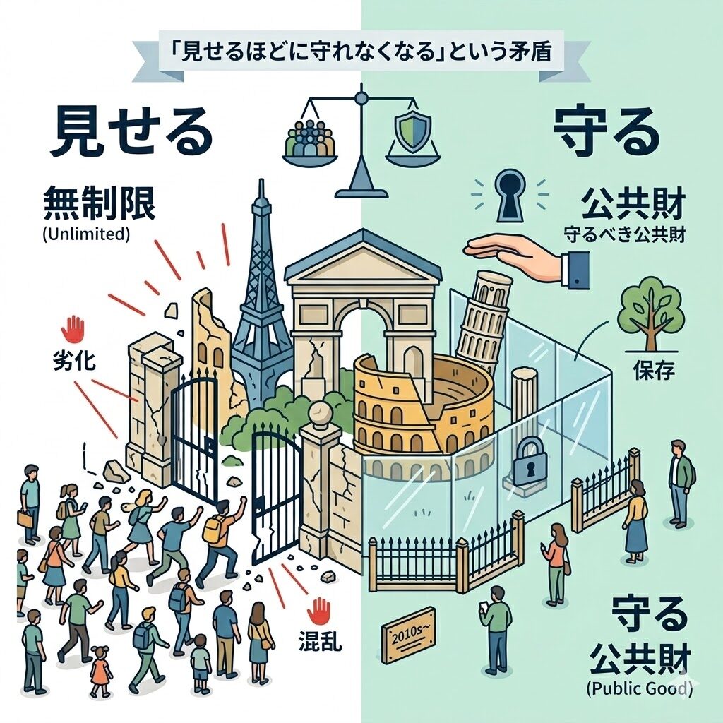 両国に共通しているのは、「すべてを無制限に公開する」という考え方から、段階的に距離を置いてきた点です。文化資産を観光のための資源としてだけでなく、守るべき公共財として位置づけ直す動きが、2010年代以降、徐々に強まっていきました。