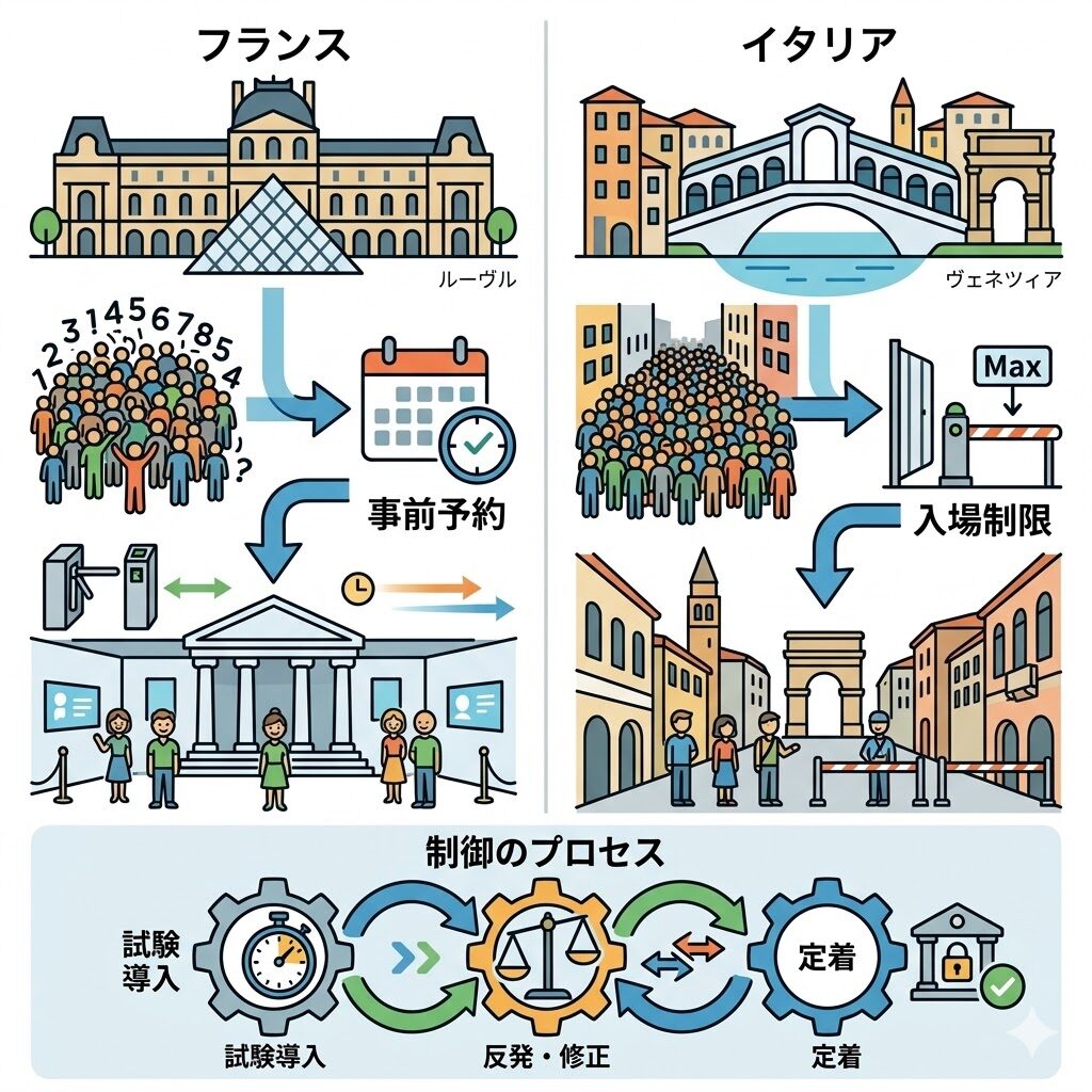 イタリアでも同様に、2010年代半ば以降、歴史都市を中心に入場制限や動線管理が本格化しました。ヴェネツィアでは、日帰り観光客の流入が市民生活に与える影響が問題視され、来訪者管理の議論が継続的に行われています。これらの取り組みは、UNWTOや各国政府の文化・観光レポートでも、文化資産を守るための観光制御の代表例として整理されています。